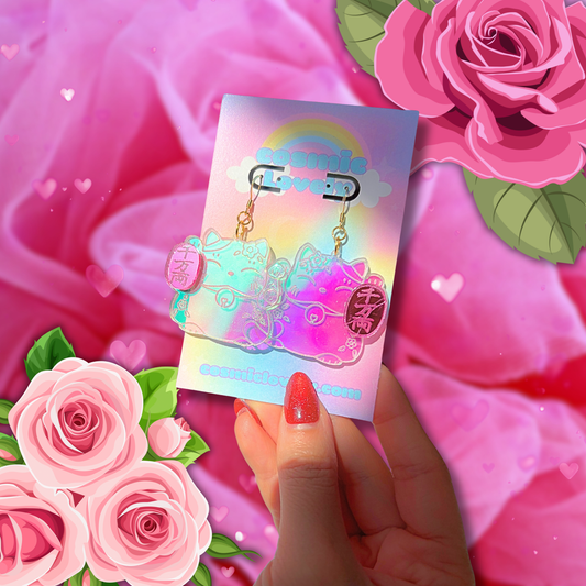 Iridescent Valentines Day love Maneki Neko Cat Earrings