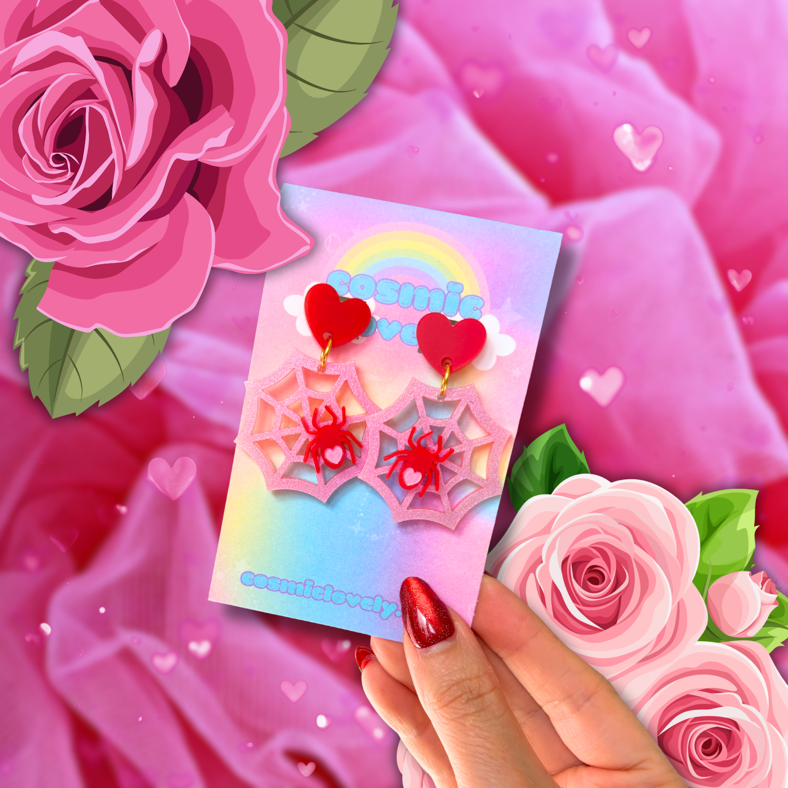 This listing is for Small Valentines Day Iridescent Pink Spider Web Earrings.