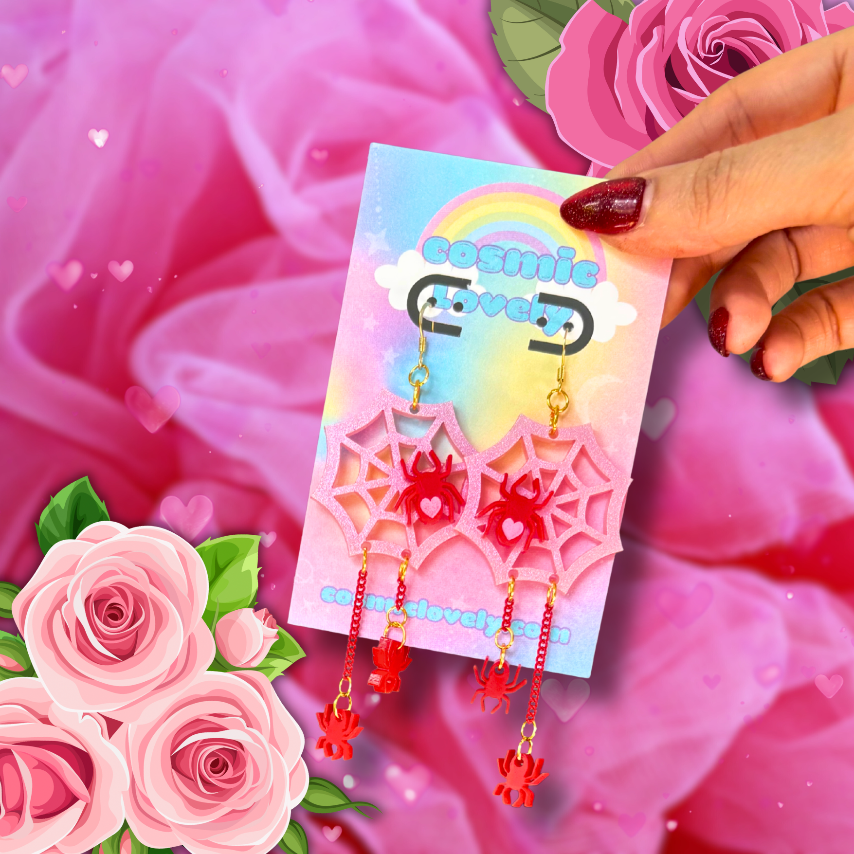 This listing is for Valentines Day Iridescent Pink Spider Web Earrings.